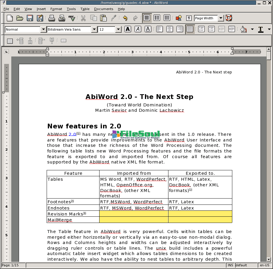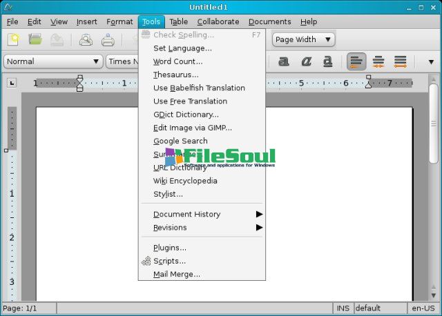The application includes all the necessary tools for formatting the text: font style (bold, underline, italics, colors, size etc.), alignment, spell checker, unlimited undo re-number control multi-columns (two and three), search function, page numbering, import images, etc.