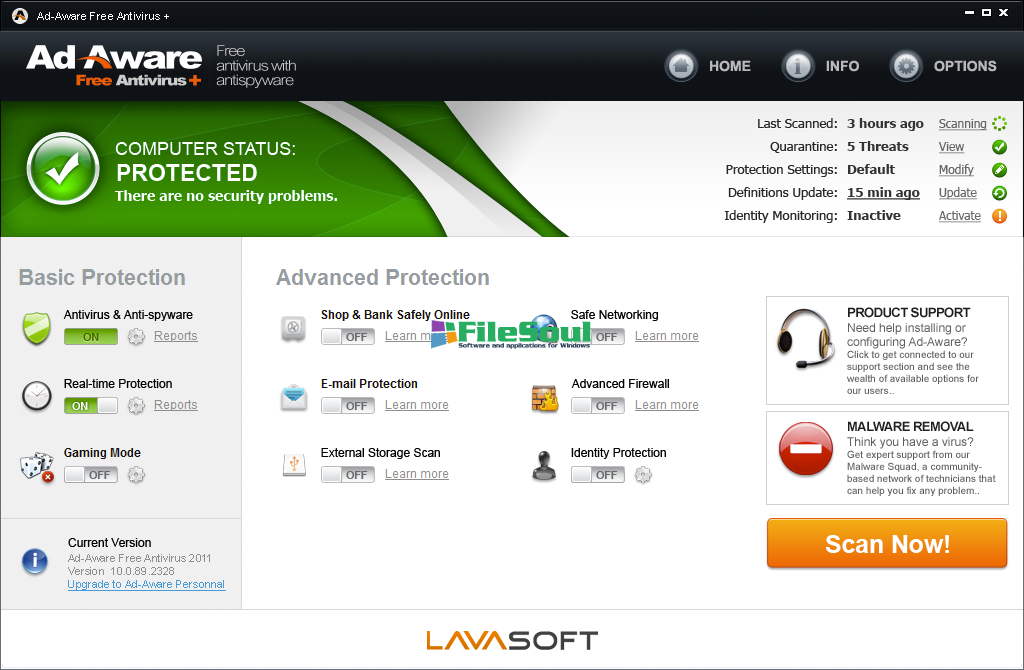 Ad-Aware Free Antivirus + has a clear interface and it is very easy to pick up as wizards to guide through the different procedures, scan spyware removal detected, real-time protection anti-phishing system.This free version of Ad- Aware Free Antivirus + benefits the common core of the software suite: antivirus, antispyware, adware and trojans.