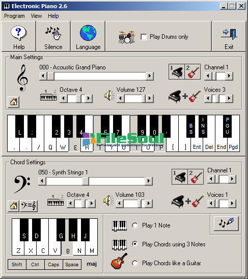 Electronic Piano is a nice and useful application for piano enthusiasts that offers the possibility to learn and play piano on computer keyboard. It offers you the possibility to play no less than 128 instruments and 47 percussion sounds allowing you to quickly play musical notes, chords and drums, up to 7 different instruments with your computer’s keyboard and select the volume and octave for melodies and chords. The chords can be played simulating the 6 strings of a Guitar. With a clean and simple interface, the application can be used by anyone, even by amateurs, requiring no MIDI technology knowledge.