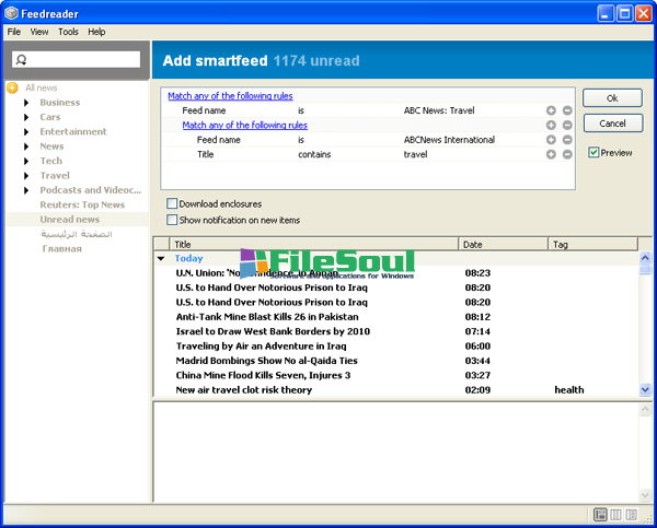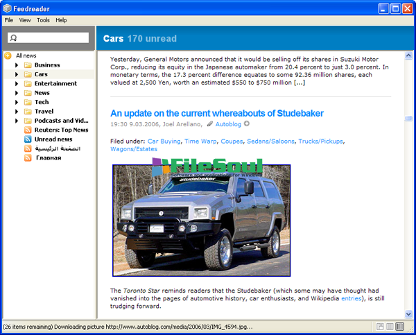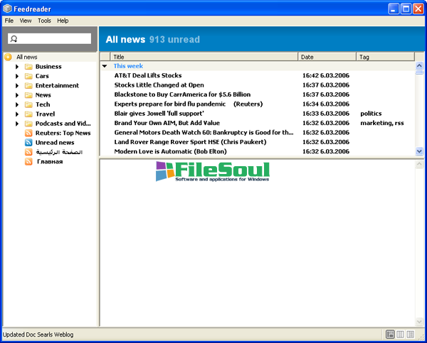 Feedreader automatically downloads updates from your favorite Web sites. So, it eliminates the need for you to constantly monitor multiple Web pages, while allowing you to immediately identify and retrieve new articles - no matter how long you've been away from your desk.