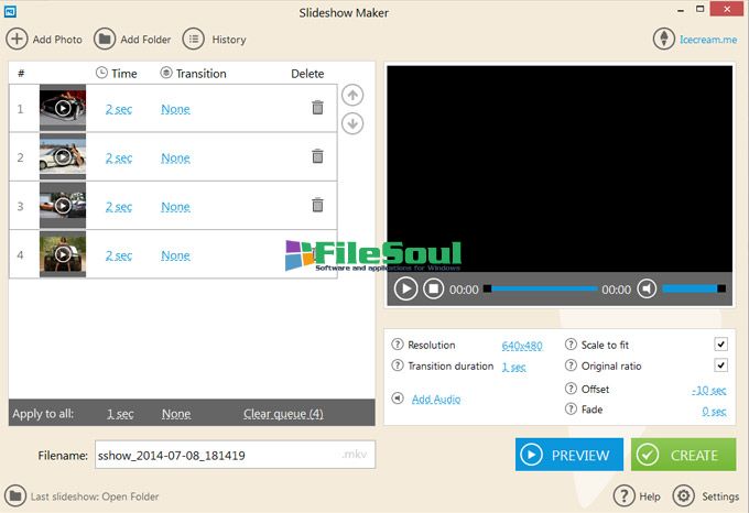 IceCream Slideshow Maker is a simple and handy application that allows you to make video slideshows with your images and videos, all complemented by effects and music in a very easy manner. You can upload images, choose transition effects (mosaic, pixelation, fades, offset) while having the control on the display time for each imported item in the slide show and the possibility to check the record with preview. The final result, if you are satisfied with your work, will be a video in MKV format.