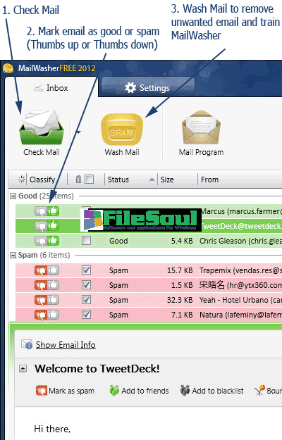 It lets user configure its settings to suit his needs to consider a message as spam. Thus, it may perform a filter, creating a black list, define a certain message type, etc. MailWasher Free is a free anti-spam software for POP3 email accounts.