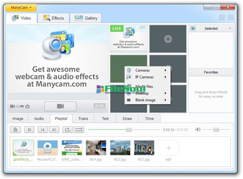 ManyCam offers a wide range of effects from the simplest to the most complicated. The "object" tab allows superimposing an Avatar mask, and movable objects with a single click. The mobile or fixed set background (sky, sunset, waterfall) "background" option attached to the image.