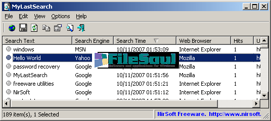 MyLastSearch is a lightweight yet useful application to help you find the last search query from your web browser. If you performed some searches for your activity and you forget where you remained, this application comes to help you: it explores your history files and cache in your web browser and locates all search queries that you made with the most important search engines - Google, Yahoo, and MSN. The list results is displayed in a table with the details about search text, search engine, search time, web browser and requested URL. You can also use this application if you need to check your children activity on the Internet.