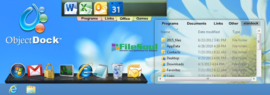 ObjectDock bar is an almost perfect replica of Aquadock available with Mac OS X. Customizable, functional , lightweight and free, this software is actually a dynamic task bar, where user can place his most used shortcuts. The passage of the mouse, the icon grows with a magnifying glass effect.