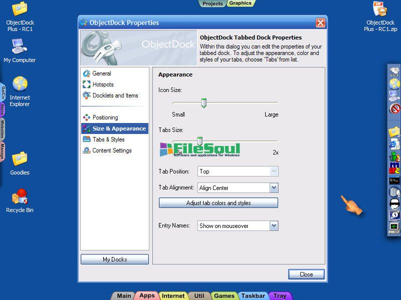 The software is fully customizable, allowing to adjust the size of icons, grouped into categories, choose a theme, adjust the transparency of the background, the location of the dock on the screen, the effect applied to mouseover and more. Note that the dock can also be configured to stay on top of the screen.