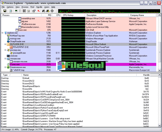 Process Explorer is a useful software developed for identifying suspicious or buggy process or investigate why a particular DLL is locked in writing. It allows to monitor the activity of process in use by the system, making it possible to determine the folders, files and registry keys that an application has accessed. For each process it is displayed detailed information such as performance, network access made, etc.