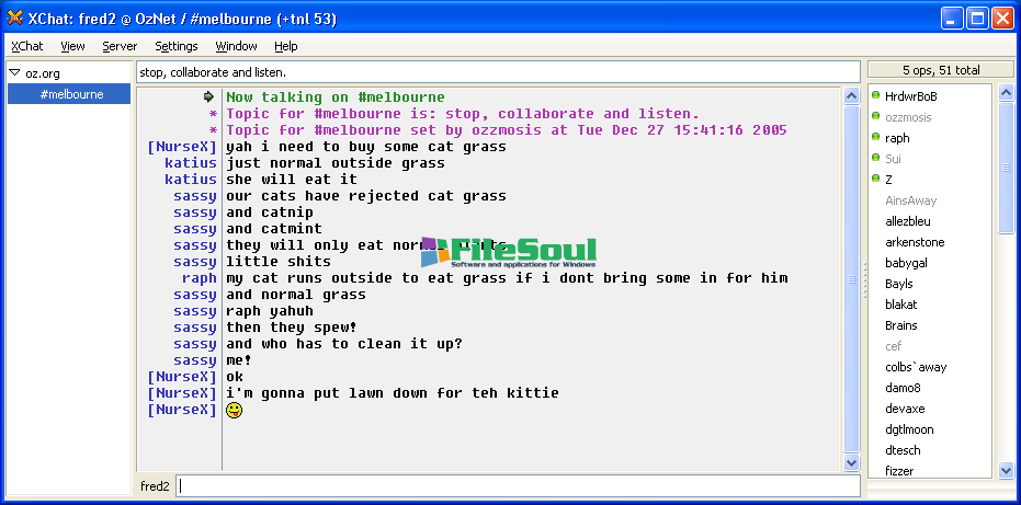 Xchat is well-known thanks to its compatibility with most operating systems IRC client. The standard options, such as server selection, colors, menus with basic commands, etc all are present. In addition, it has nice features like the ability to connect to multiple servers (multiserver).